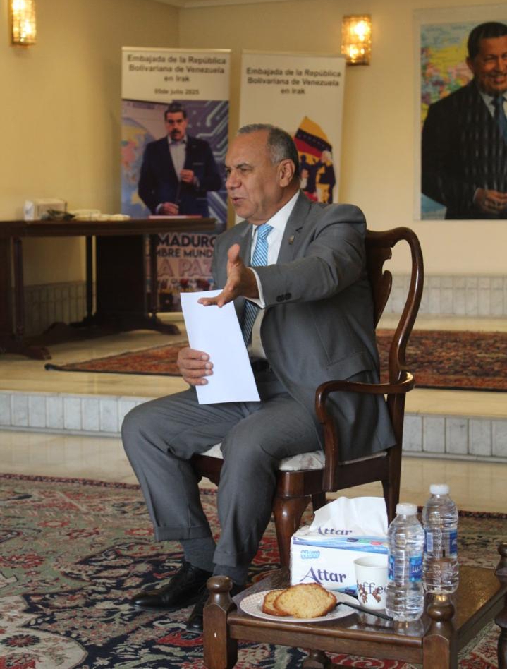 La reunión estuvo dirigida por el embajador venezolano en Bagdad, Arturo Aníbal Gallegos Ramírez, con la asistencia de representantes del sindicato de la prensa iraquí y del Centro de Estudios Estratégicos, además de amigos de la Revolución Bolivariana que forman parte de la coordinación Antifascista.